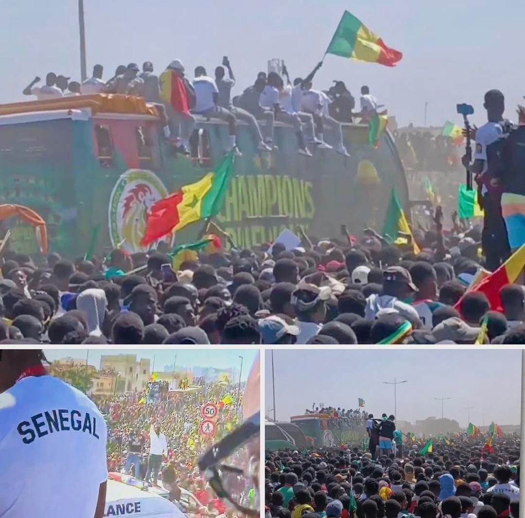 Sur l’autoroute d’abord, puis à la Patte d’Oie et dans plusieurs grandes artères de la capitale, la foule grossit sans cesse. À chaque carrefour, à chaque pont, à chaque arrêt improvisé, des milliers de Sénégalais attendent le passage du bus des champions d’Afrique aux deux étoiles.